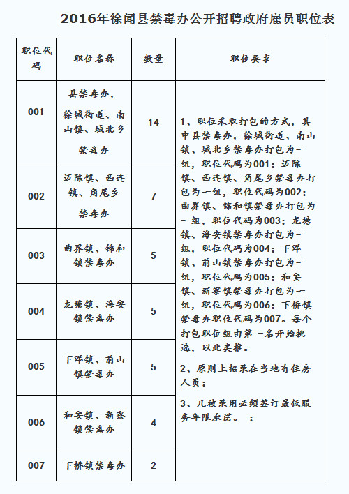 為了增強我縣禁毒隊伍建設(shè),進一步推進我縣禁毒工作,根據(jù)《廣東省事業(yè)單位公開招聘人員辦法》(省政府令第139號)的有關(guān)規(guī)定和《關(guān)于配備縣禁毒辦專職工作人員的批復(fù)》(徐機編辦【2016】第20號)、《關(guān)于設(shè)立鄉(xiāng)鎮(zhèn)禁毒辦的批復(fù)》(徐機編辦【2016】第21號)的有關(guān)文件,結(jié)合實際,我縣決定面向社會公開招聘42名政府雇員。為使本次公開招聘工作順利開展,現(xiàn)將有關(guān)事項公告如下: