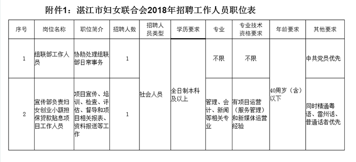 本次招聘人員共2名,具體職位為:組聯(lián)部工作人員1名,宣傳部負(fù)責(zé)婦女創(chuàng)業(yè)小額擔(dān)保貸款貼息項(xiàng)目工作人員1名。