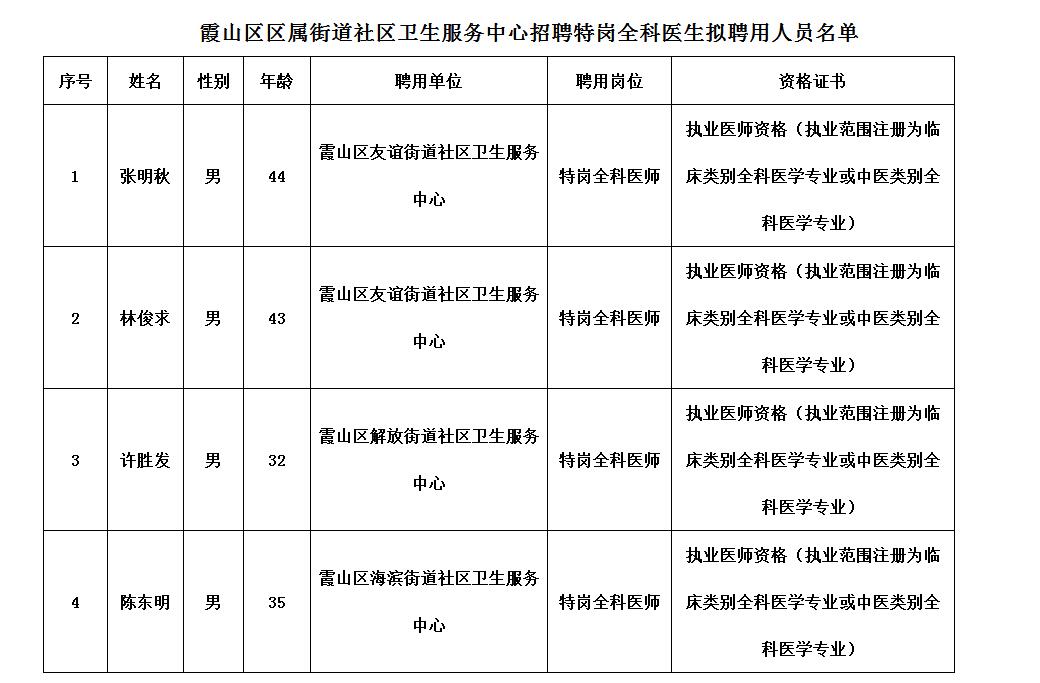 根據(jù)《廣東省事業(yè)單位公開招聘人員辦法》和《霞山區(qū)區(qū)屬街道社區(qū)衛(wèi)生服務中心公開招聘特崗全科醫(yī)生的公告》的有關規(guī)定,經過筆試、體檢、考核等程序,擬聘用張明秋等4位同志為衛(wèi)生系統(tǒng)特崗全科醫(yī)生,現(xiàn)予公示。如有異議或其它問題,請以書面形式(報考必要的證明材料)向霞山區(qū)衛(wèi)生和計劃生育局和霞山區(qū)人力資源和社會保障局反映。