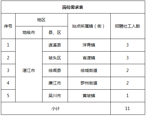 本次招聘的社工崗位涉及5個(gè)鎮(zhèn)(街)社工站,共需招聘11名社工,具體崗位情況如下: